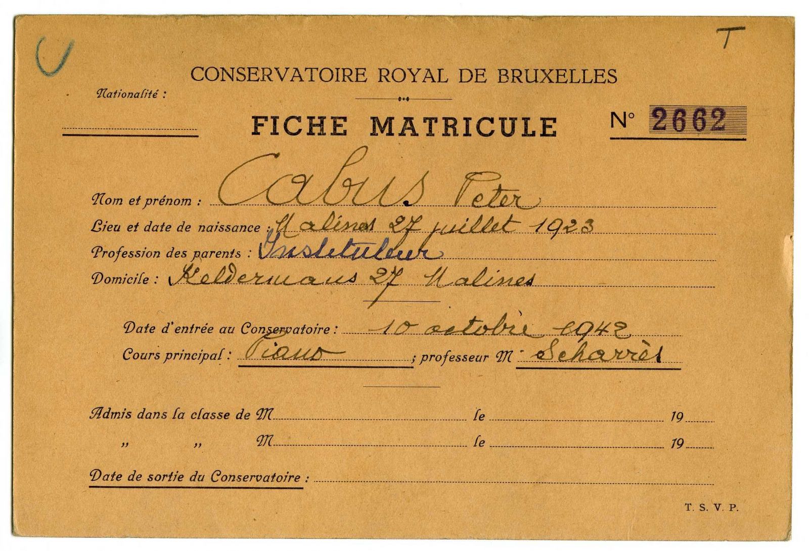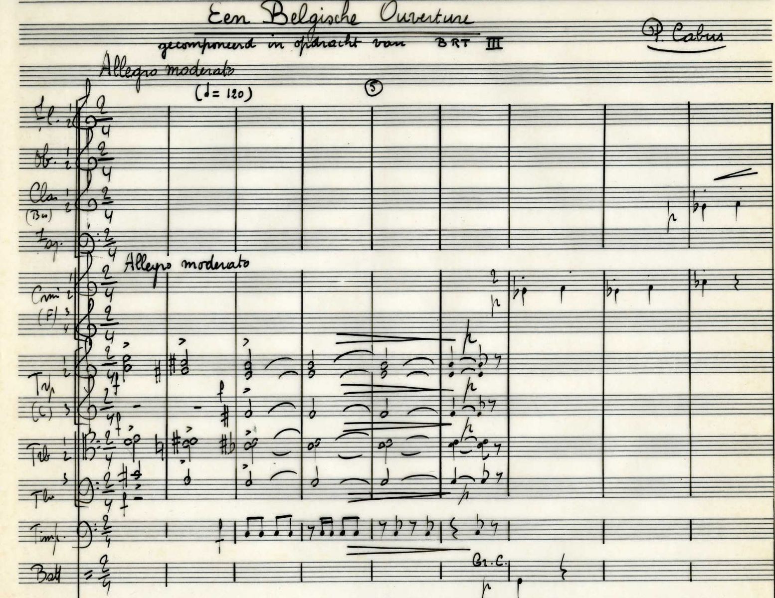 Peter Cabus was born in Mechelen on 27 July 1923. He was raised in a musical family. He took his first music lessons at the City Conservatory in his birth place, following among other subjects, harmony and counterpoint with Godfried Devreese. As a member of the choir of Saint Rombouts he had his first accquaintance with the Gregorian repertoire and the style of the Flemish polyphonists. After his secondary schooling (Greek-Latin) he chose for professional musical training.