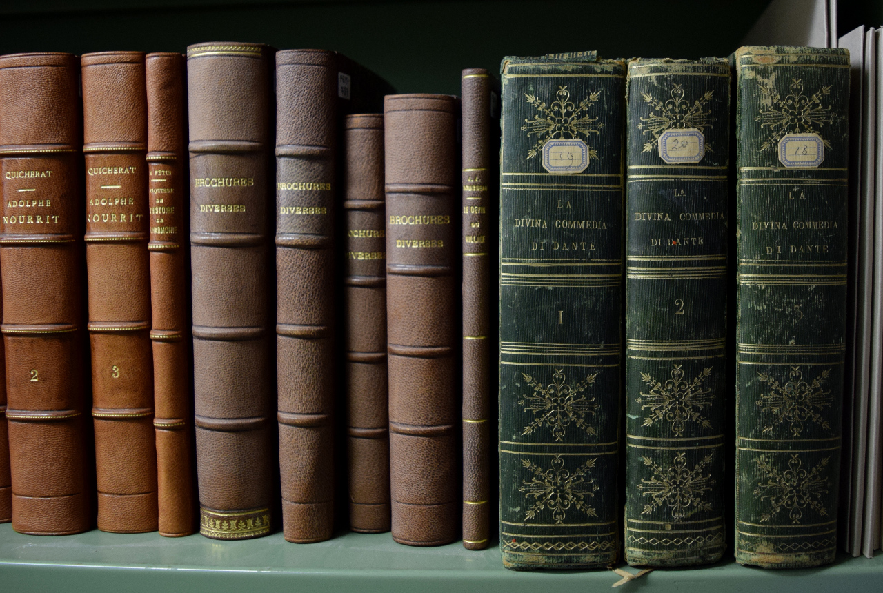 Rossini’s persoonlijke exemplaar van Dantes ‘Divina Commedia’ in de originele banden. Links recentere boekbanden uit 1911, gerealiseerd in opdracht van Michotte. FEM-791.