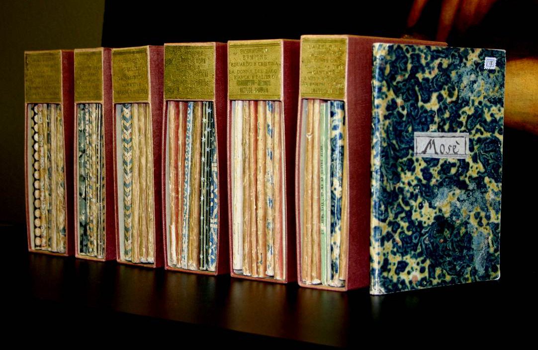 Giuseppe Rossini (ca. 1760-1839), vader van Gioachino, verzamelde de libretti van de premières van de opera’s en cantates van zijn zoon. Hij gaf die boekjes een eenvoudige papieren band, meestal met kleurendruk, waarop hij een zelfgemaakt etiket kleefde. FEM-858-863.     Giuseppe Rossini (ca. 1760-1839), vader van Gioachino, verzamelde de libretti van de premières van de opera’s en cantates van zijn zoon. Hij gaf die boekjes een eenvoudige papieren band, meestal met kleurendruk, waarop hij een zelfgemaakt etiket kleefde. FEM-858-863.