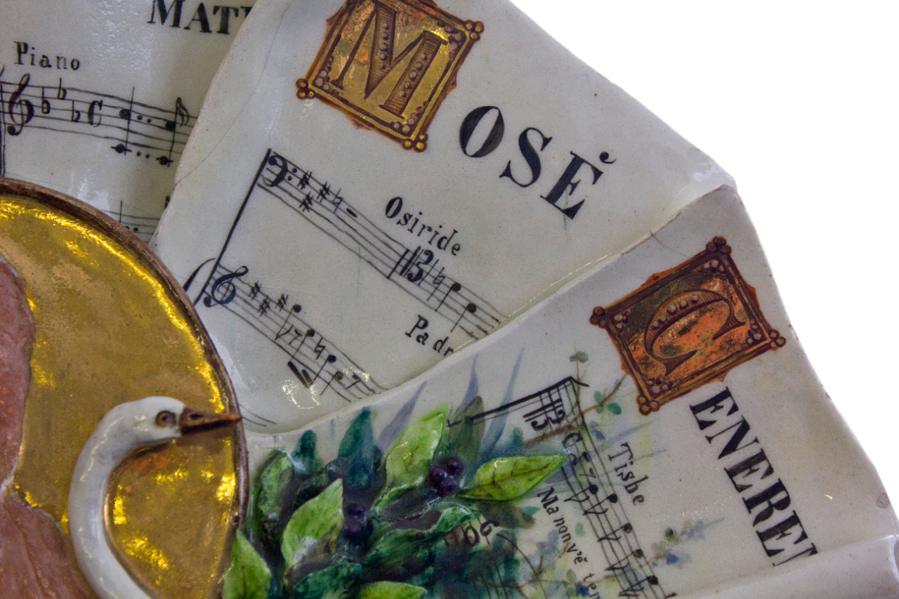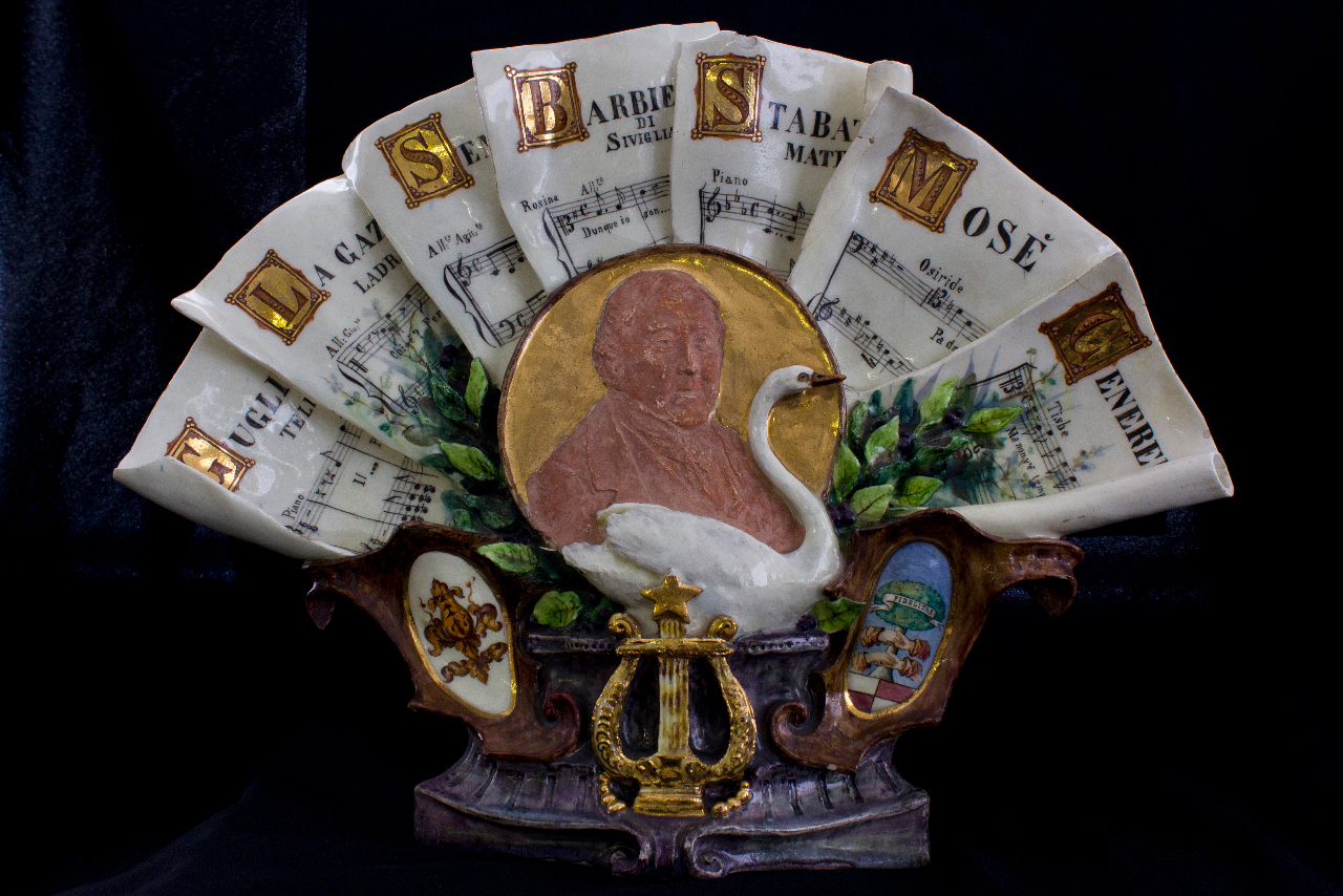 Centraal staat het basreliëf met het portret in terracotta van Rossini. De componist wordt ook allegorisch voorgesteld door de witte zwaan en het wapenschild van zijn geboortestad: een erg duidelijke verwijzing naar zijn bijnaam ‘de zwaan van Pesaro’. Rond de centrale plaquette worden Rossini’s  bekendste werken geëtaleerd. De vaas is van Italiaanse makelij, ca. 1850. FEM-851.     Centraal staat het basreliëf met het portret in terracotta van Rossini. De componist wordt ook allegorisch voorgesteld door de witte zwaan en het wapenschild van zijn geboortestad: een erg duidelijke verwijzing naar zijn bijnaam ‘de zwaan van Pesaro’. Rond de centrale plaquette worden Rossini’s  bekendste werken geëtaleerd. De vaas is van Italiaanse makelij, ca. 1850. FEM-851.