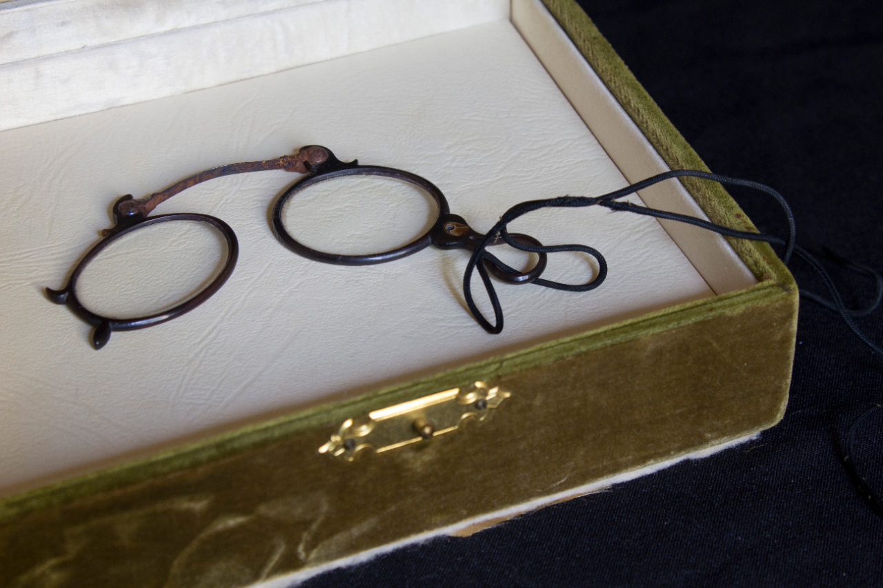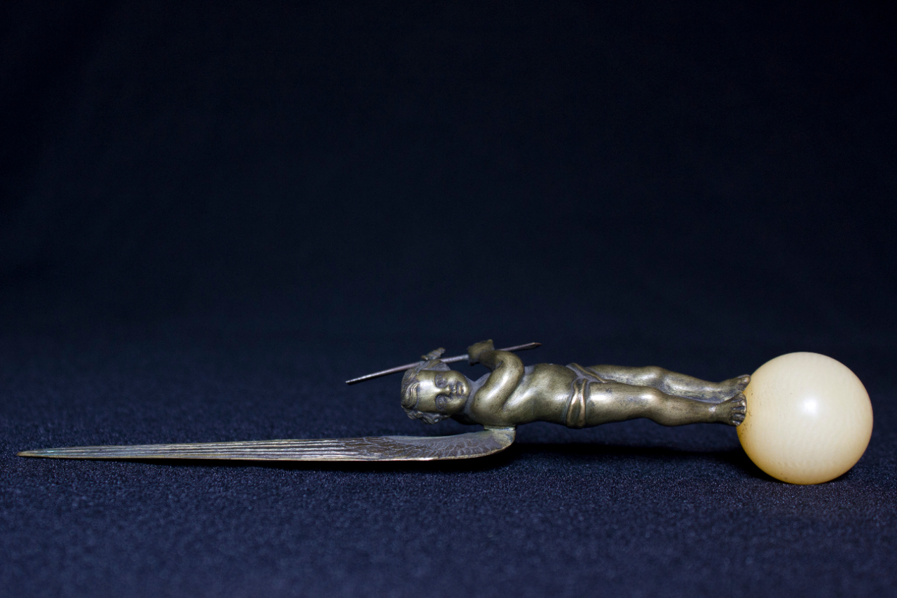 Stijlvolle briefopener van Rossini: een putto in brons met schrijfstift op een natuurstenen bol. FEM-866.      Pince-nez van Rossini, in een fluwelen doosje, gemaakt in opdracht van Michotte. FEM-855.