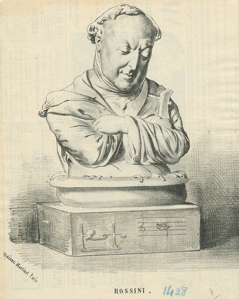 Anonieme karikatuur van Rossini, gebaseerd op een beeld van Jean-Pierre Dantan (1800-1869). De verwijzing naar de culinaire reputatie van Rossini is duidelijk: de componist zit in een bord pasta met een lier in de armen. Op de sokkel staat links een kip aan het spit, rechts een notenbalk. FEM-185.