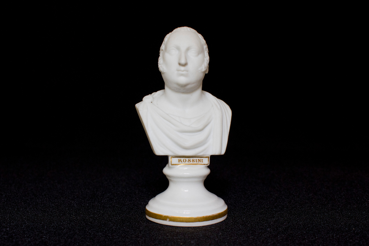 Borstbeeldje van Rossini met Romeinse toga uit de collectie Michotte. FEM-856.