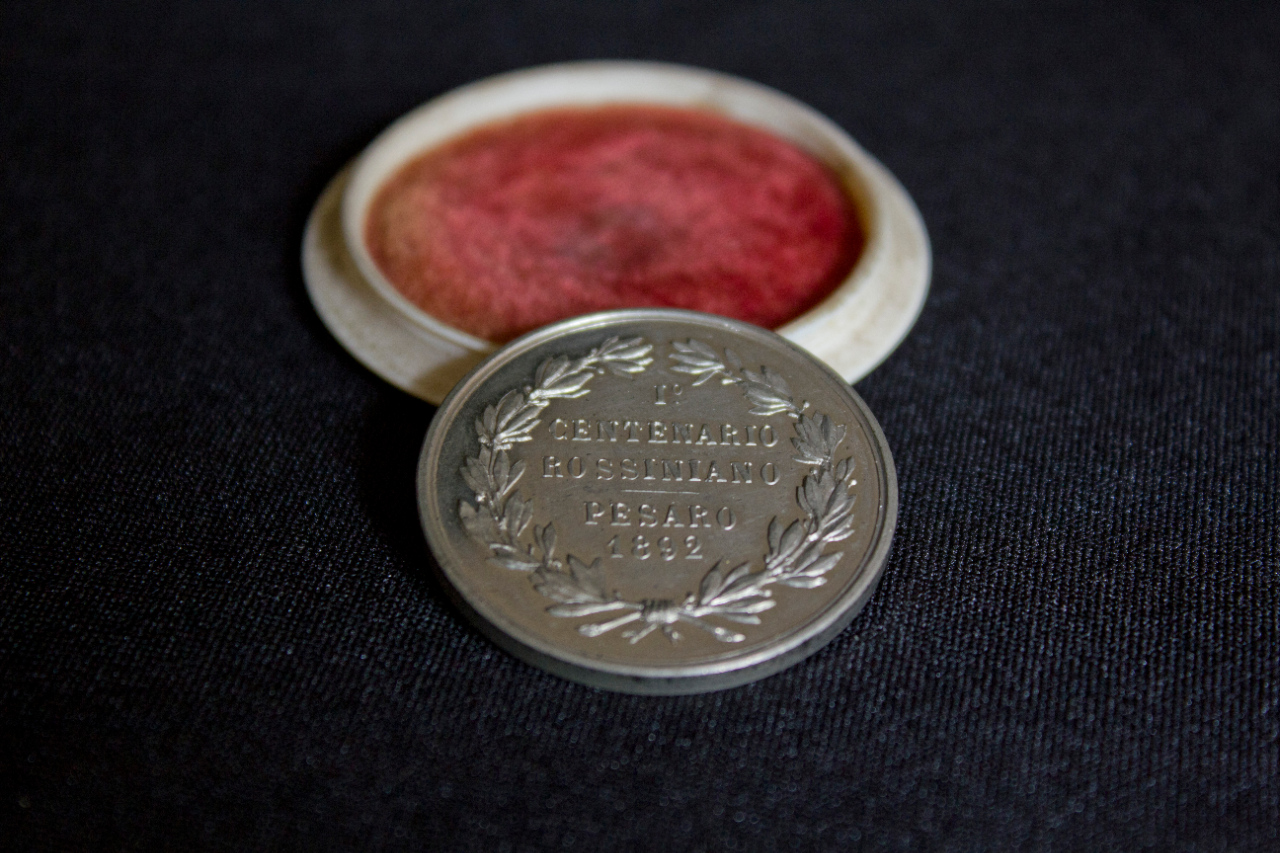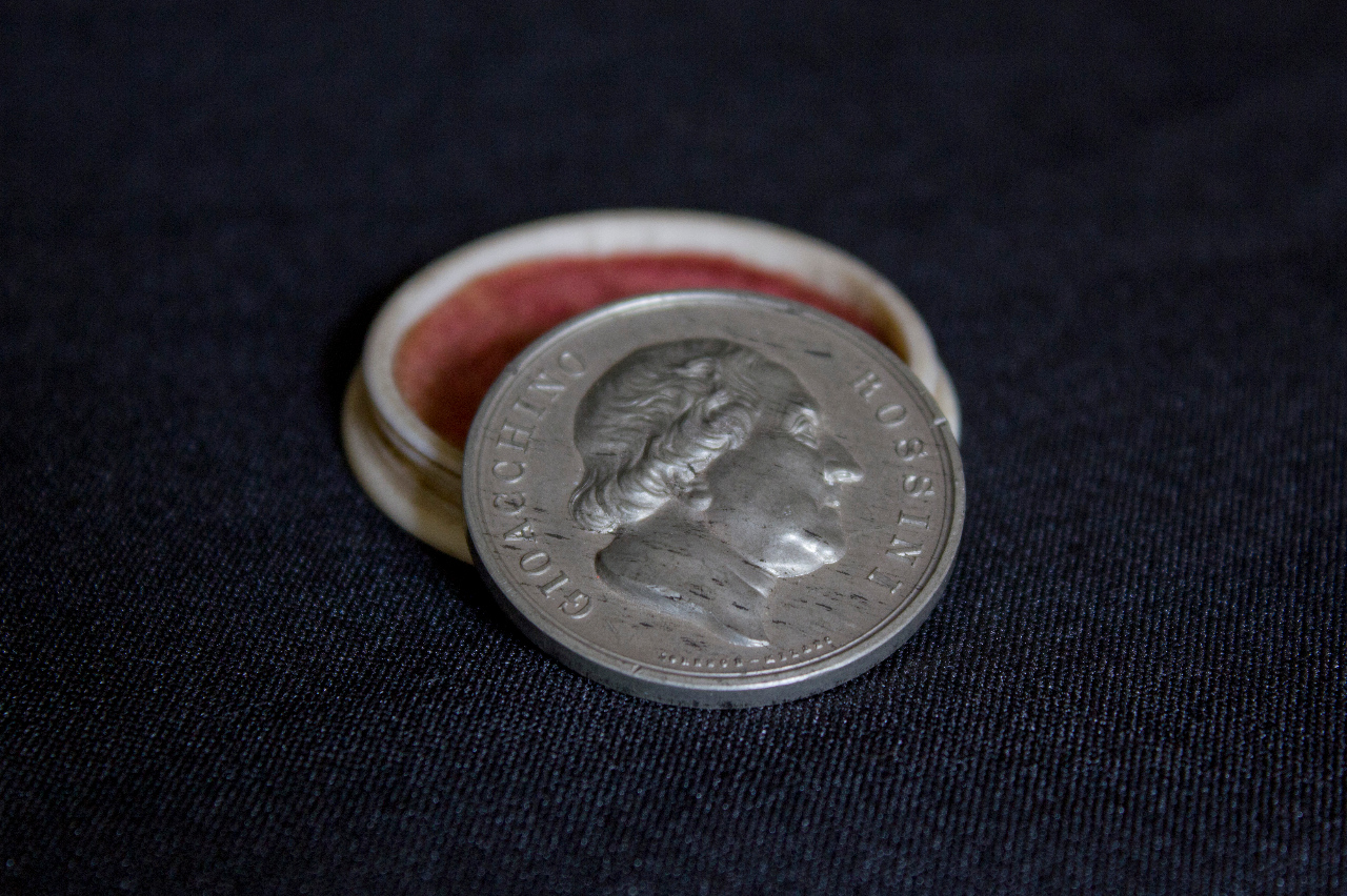 Verzilverde medaille van Rossini in een ivoren doosje, gemaakt in Milaan in 1892, ter gelegenheid van het centinarium van zijn geboorte. FEM-857.     Verzilverde medaille van Rossini in een ivoren doosje, gemaakt in Milaan in 1892, ter gelegenheid van het centinarium van zijn geboorte. FEM-857.